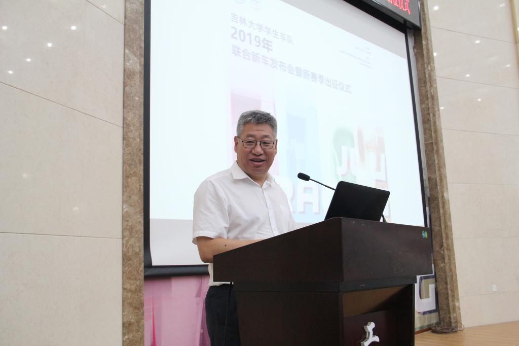 吉林大学党委副书记冯正玉老师为到场来宾和师生作了精彩的讲话,为即将参加德国、日本大学生方程式汽车大赛的车队队员授予校旗。冯正玉老师嘱托车队同学在赛场充分展现吉大学子的深厚知识底蕴和良好精神面貌,祝愿学生车队旗开得胜、马到功成、载誉归来;希望学校各部门汇聚合力,拧成一股绳、下好一盘棋,为学生的科技创新和实践锻炼构筑护城河、打通产业链、营造生态圈,打造出更多类似学生车队的示范品牌,在全国乃至全世界奏响吉大学子的创新号角。