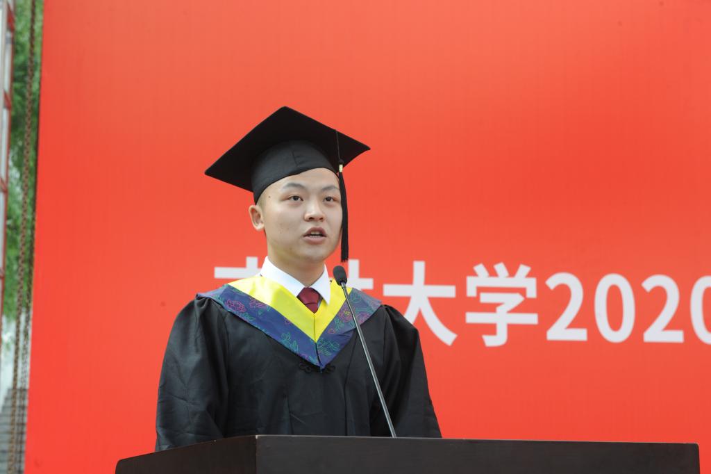 吉林大学自强自立大学生、工业设计专业谢坚同学代表毕业学生对母校、学院和各位老师表达了感谢和祝福,回忆四年来在白山黑水间的青春时光,将永远怀念恩师的教导、同窗的陪伴、拼搏的汗水,“一日吉大人,一生吉大情。”