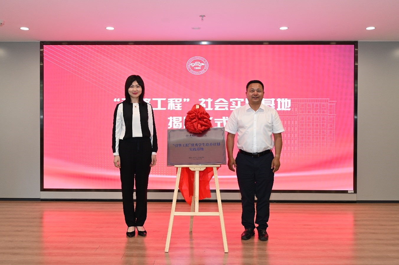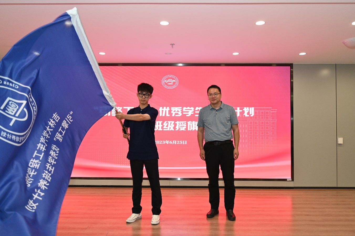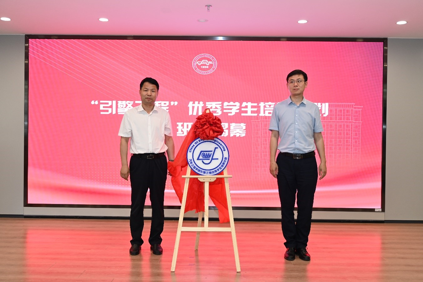“引擎工程”优秀学生培养计划班徽、班旗发布仪式上,设计者王悦欢同学介绍设计理念,发展规划处处长黄河、团委书记马景惠为“引擎工程”优秀学生培养计划班徽揭幕,党委学生工作部部长代磊为“引擎工程”优秀学生培养计划班级授旗