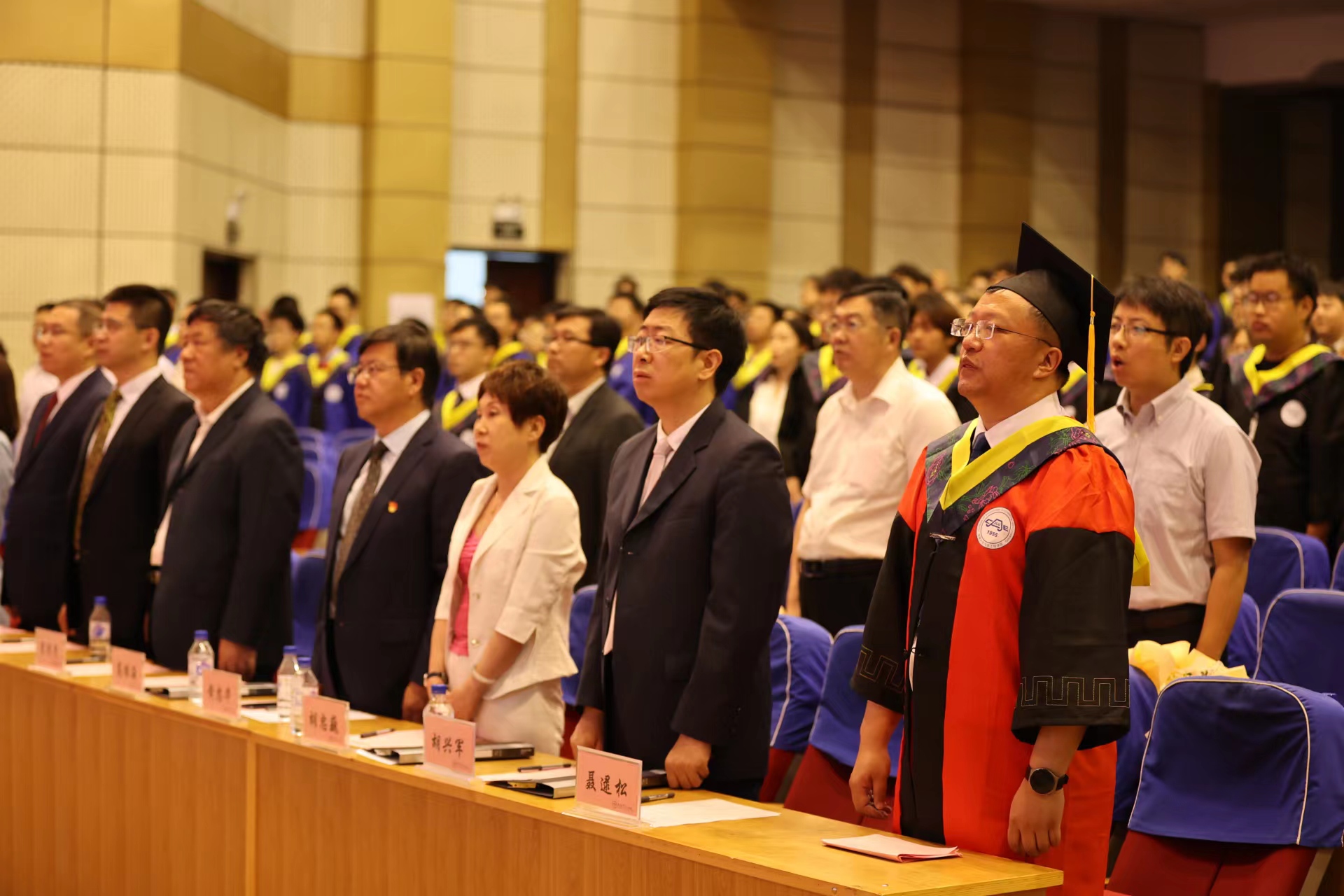 副院长胡兴军老师宣读《关于2023届毕业和授予学位的决定》,院长高振海教授,学位评定委员会主任宋传学教授、副院长王忠恕教授、胡兴军教授、朱冰教授为在场毕业生代表拨穗正冠,颁发学位证书并合影留念。